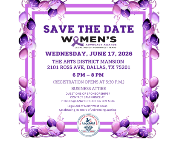 Join us on June 17 at The Arts District Mansion in Dallas for the 2026 Women’s Advocacy Awards. We’ll celebrate our distinguished honorees and 75 years of advancing justice across 114 counties in North and West Texas. Visit here to register or help sponsor the event.